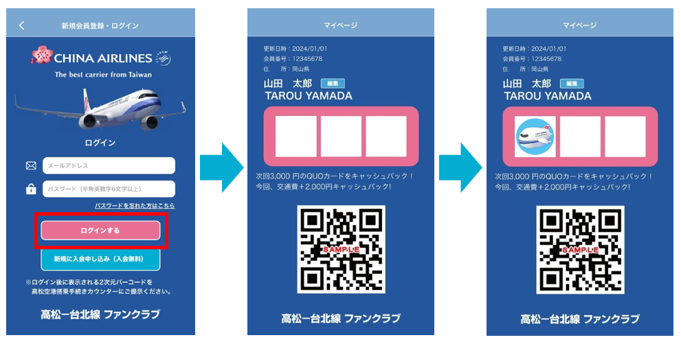 ②表示されたマイページQRコードを高松空港出発時チェックインカウンターで提示