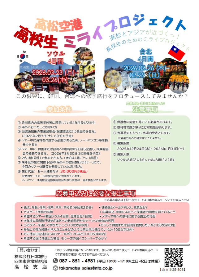 ソウルまたは台北を舞台に、海外旅行体験ツアーを自ら企画し、実際に参加いただける香川県内の高校1年生・2年生を募集しています。
