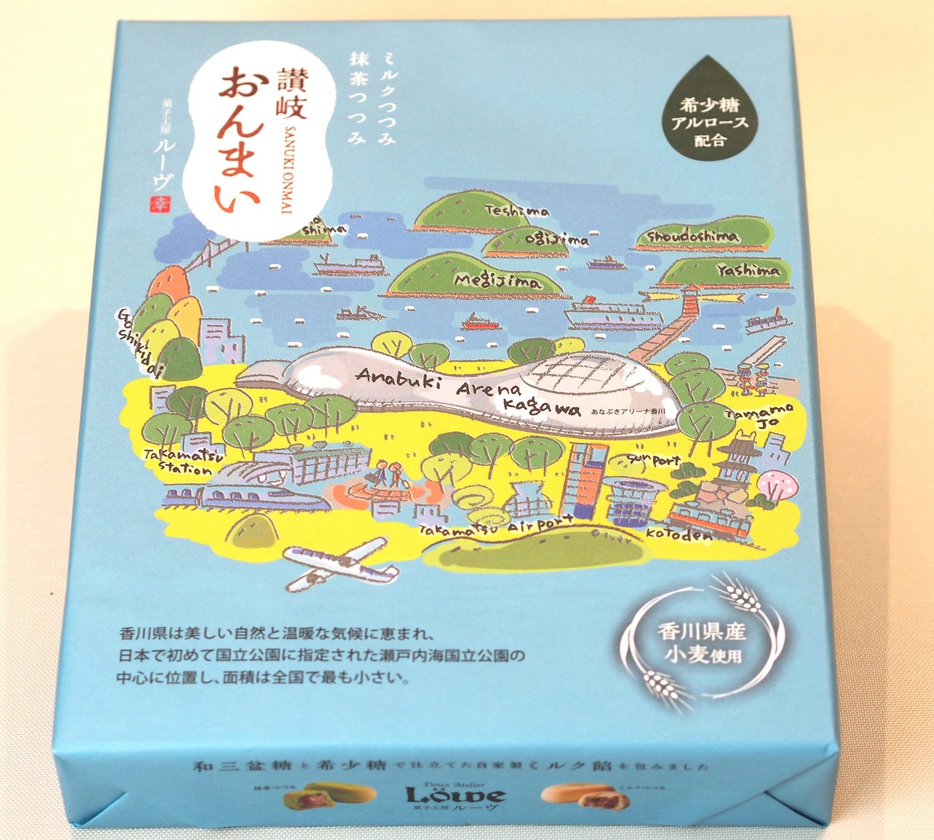 「讃岐おんまい8個入」1,080円(税込)(メーカー:ルーヴ)和三盆と希少糖で作られた自家製みるく餡を包んで焼き上げたお菓子です。やさしい甘さの「みるくつつみ」と香川名産緑茶の高瀬茶と薫り高い抹茶を練りこんだ「抹茶つつみ」4個ずつ入っております。